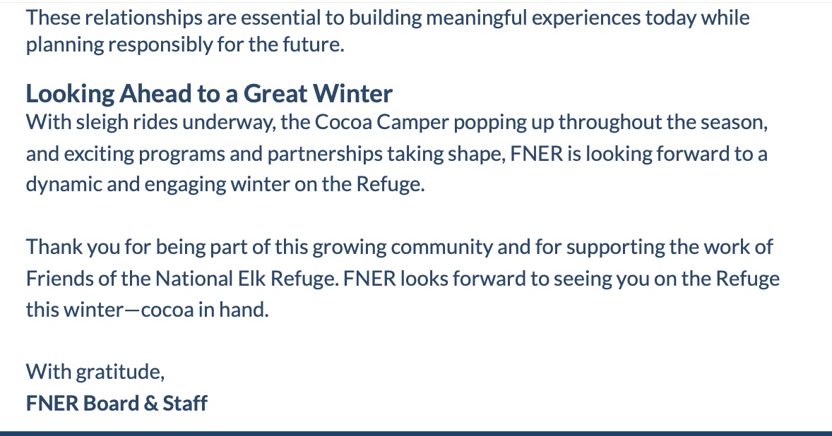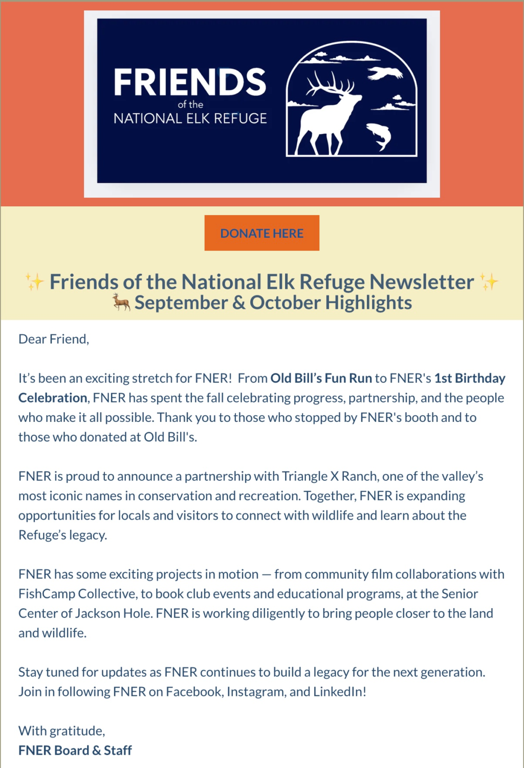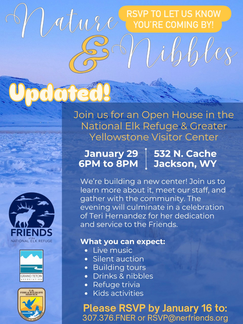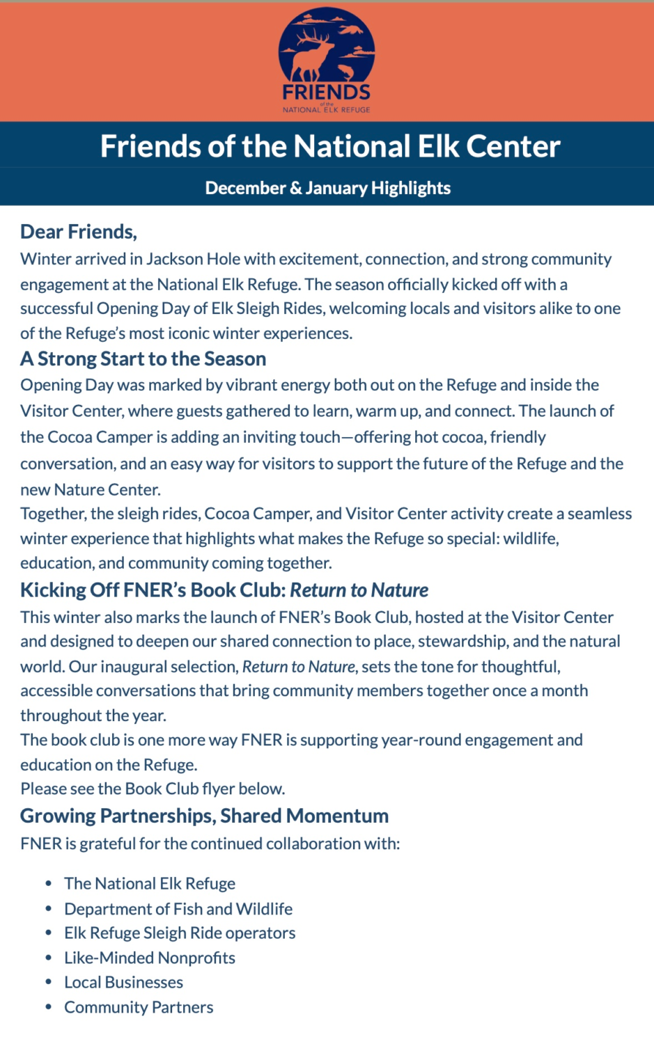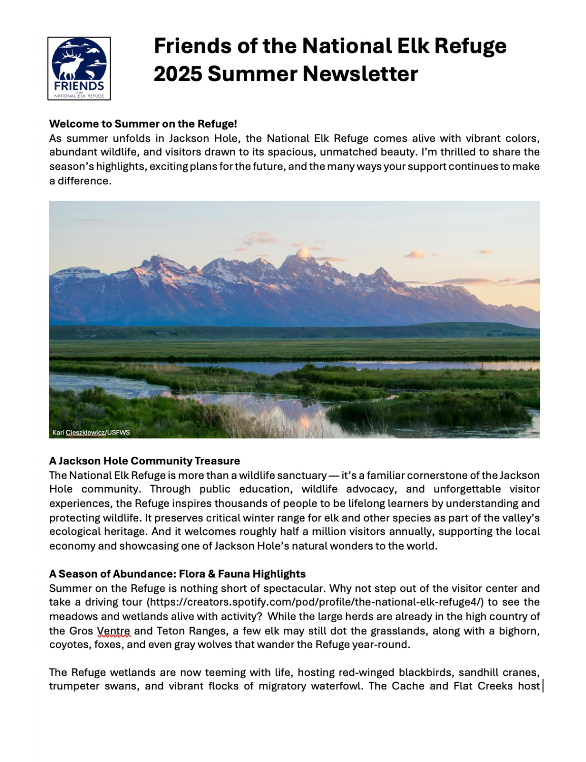 Friends of the National Elk Refuge, Inc. is a Wyoming nonprofit corporation registered under IRS Code 501(c)(3). The Friends welcome both cash and in-kind donations. Cash donations may be tax-deductible depending on donor’s individual circumstances. The Friends do not appraise or assess the value of in-kind donations such as investment securities, materials, or services. Determination of the tax-deductible value of in-kind donations is the responsibility of the donor.